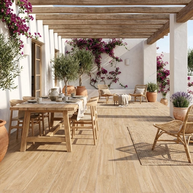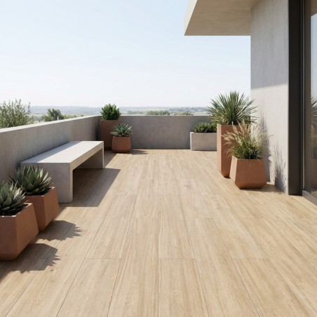 Le carrelage de terrasse Dream Natural 20x120 cm est une alternative élégante et durable à un revêtement de terrasse en bois traditionnel. Avec son design moderne et unique, ce carrelage imitation bois de couleur chêne est idéal pour les terrasses qui entourent les piscines.