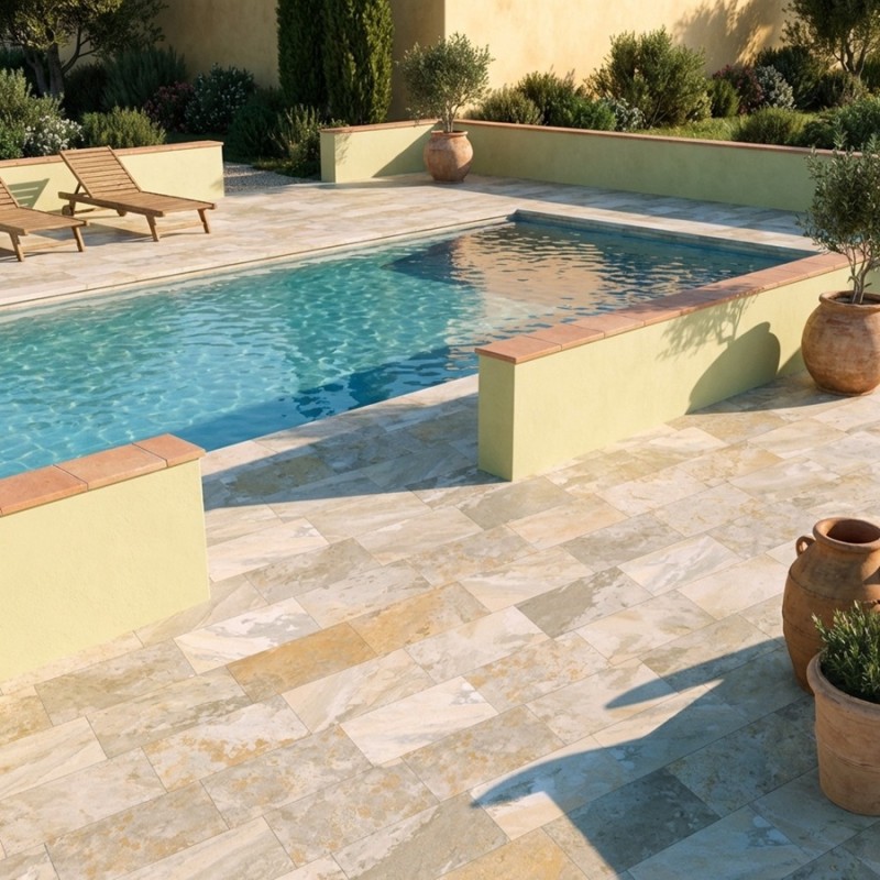 Résistant au gel, à l’usure et facile d’entretien, il est également compatible avec les environnements humides. Sa teinte sable permet des associations douces et lumineuses, parfaites pour créer une atmosphère naturelle, zen ou contemporaine.