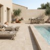 Les fabricants proposent des gammes de carrelage effet travertin spécifiquement conçues pour l'extérieur. Ces produits bénéficient d'une finition de surface légèrement texturée, non abrasive au toucher, qui leur confère un indice de glissance élevé (R11). La sécurité est ainsi garantie, même au bord de l'eau. Par ailleurs, les couleurs et les motifs du carrelage sont intégrés dans la masse et fixés lors de la cuisson. Ils sont donc insensibles aux UV et ne subiront aucune décoloration dans le temps, conservant leur aspect originel année après année.