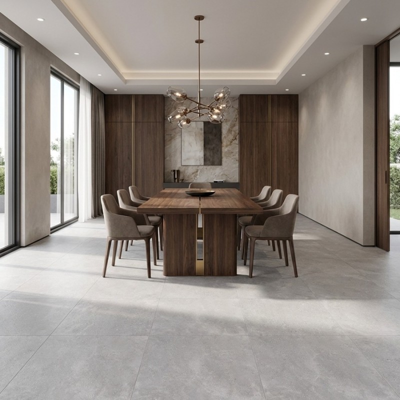 Son format XXL 120x120 cm et sa surface mate limitent les joints, offrant une sensation d’espace et de continuité idéale pour les grands volumes.
