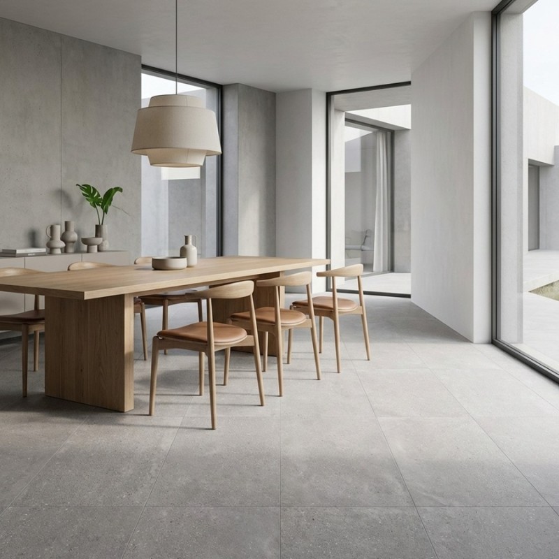 Grâce à sa surface mate et sa finition soignée, ce carreau grand format offre un rendu visuellement épuré, limitant les joints et donnant un effet de continuité fluide sur le sol.
