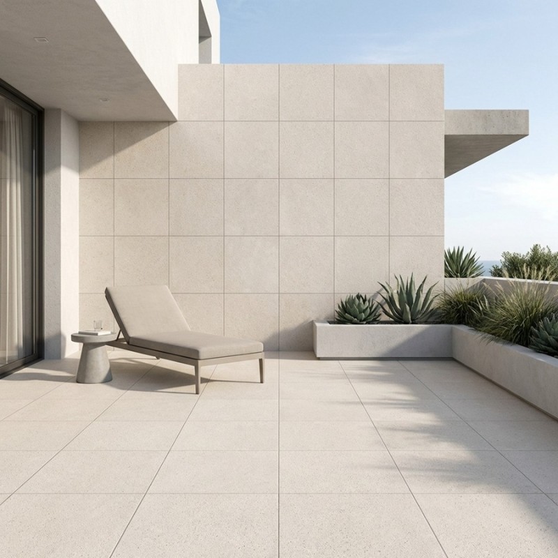 Son format XXL 120x120 cm transforme les terrasses en véritables espaces de vie à ciel ouvert. Les joints sont réduits au minimum, offrant un effet de continuité visuelle exceptionnel. Grâce à sa finition R10 antidérapante, il garantit une adhérence optimale, même sur un sol humide, notamment autour des piscines.