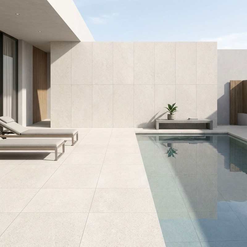 Modernité, sécurité et élégance naturelle : le carrelage extérieur béton ciré beige 100x100 R10 rectifié incarne la continuité parfaite entre l’intérieur et l’extérieur. Sa surface antidérapante, son aspect béton et sa couleur beige nuancée en font un revêtement contemporain idéal pour les terrasses, patios et abords de piscine.