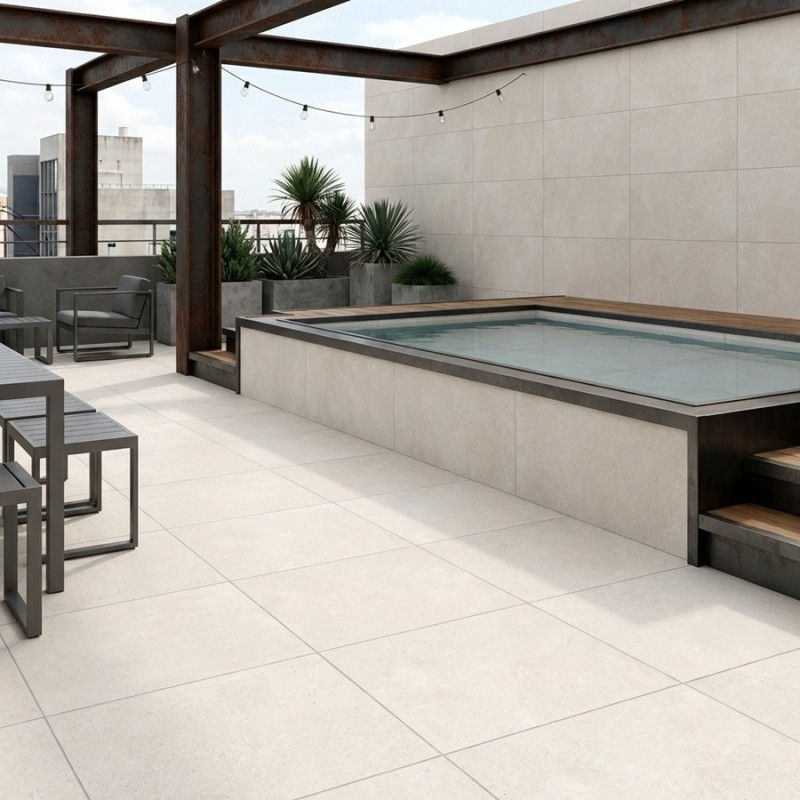 Le carrelage béton ciré beige 100x100 R10 offre un vaste champ de possibilités pour la décoration extérieure :