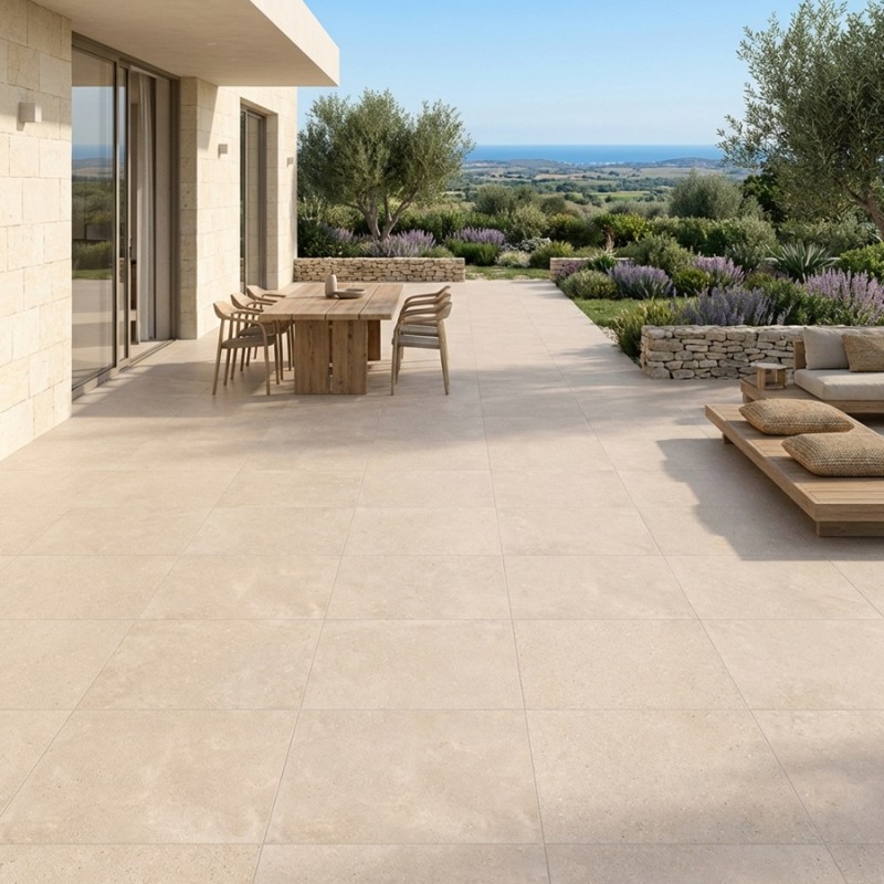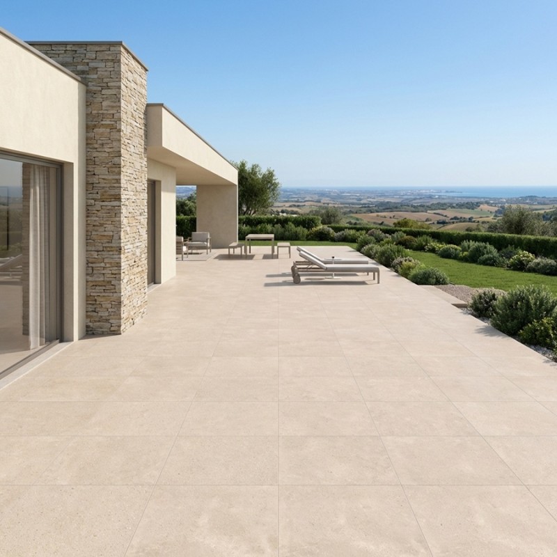 Le carrelage Terra 100x100 extérieur s’accorde parfaitement avec un mobilier en bois naturel, des murs blancs, ou des teintes sable et gris clair.
