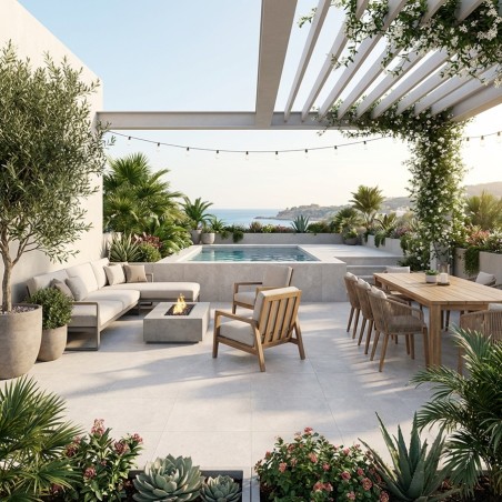 Ce revêtement est idéal pour les terrasses contemporaines, les abords de piscine ou les pièces extérieures couvertes, grâce à sa résistance et à son esthétique haut de gamme.