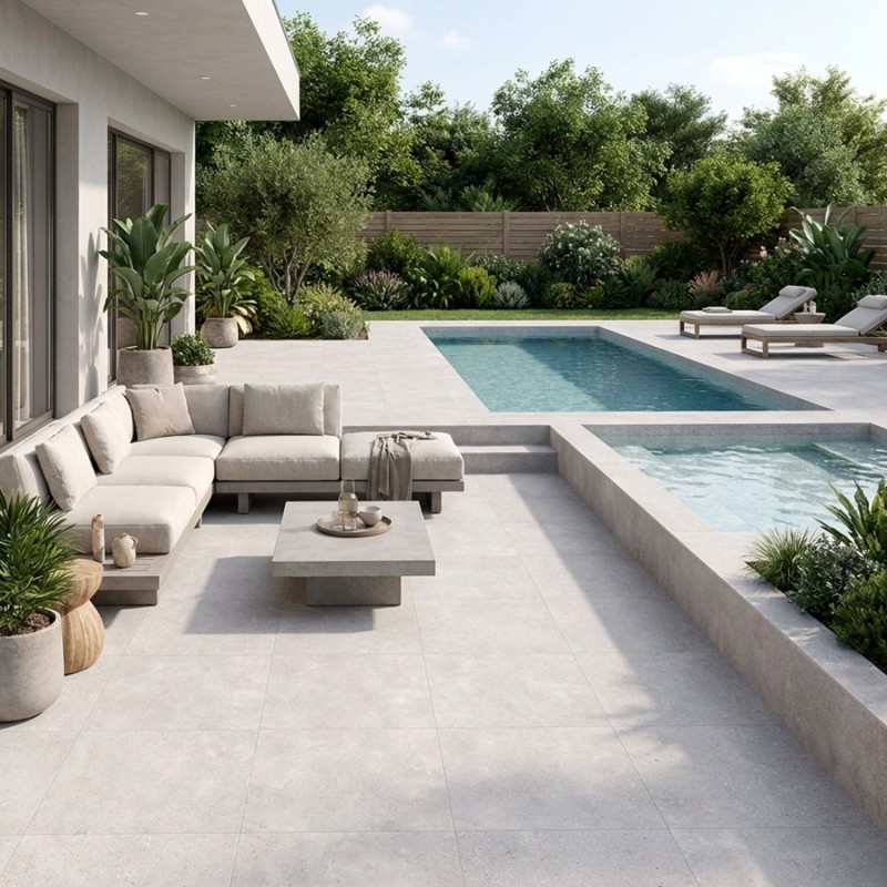 Sa surface mate et sa finition R10 antidérapante assurent sécurité et confort sur le sol extérieur, tout en maintenant une esthétique épurée et contemporaine.
