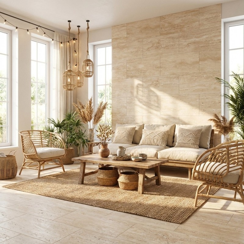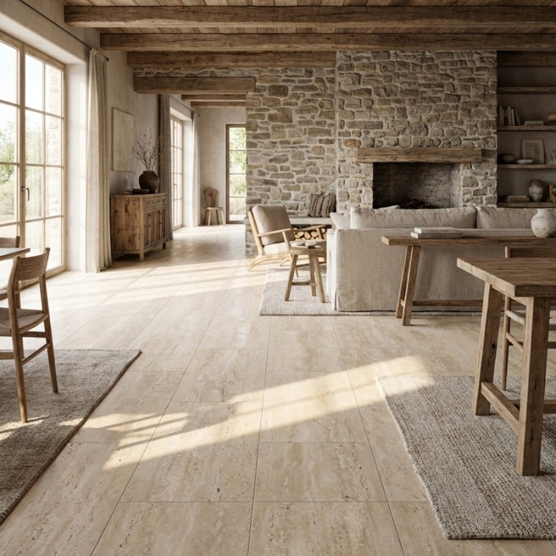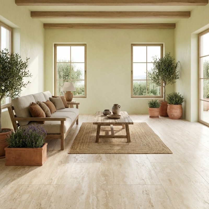 Le carrelage Travertino 60x120 se marie parfaitement avec les matériaux naturels comme le bois clair, les meubles en rotin ou les textiles écrus. Il convient aussi aux intérieurs contemporains, combiné à des touches métalliques ou à un mobilier minimaliste.