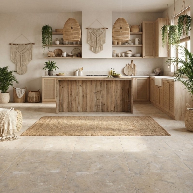Sa couleur beige douce, enrichie de nuances minérales et d’un effet pierre subtilement veiné, apporte chaleur et luminosité aux pièces de vie. Fabriqué en grès cérame, il allie résistance, stabilité et facilité d’entretien, sans les contraintes du travertin naturel.