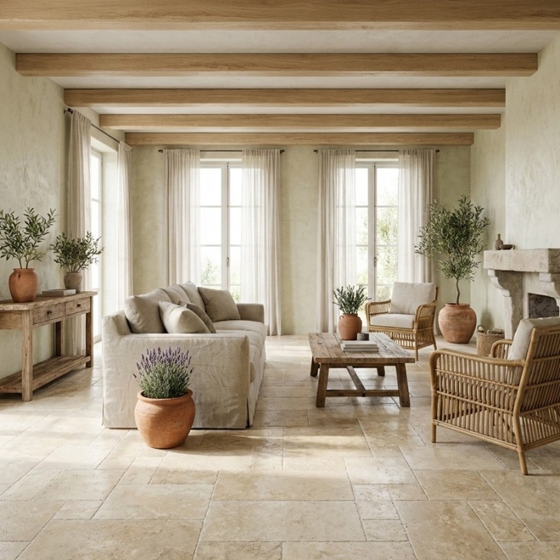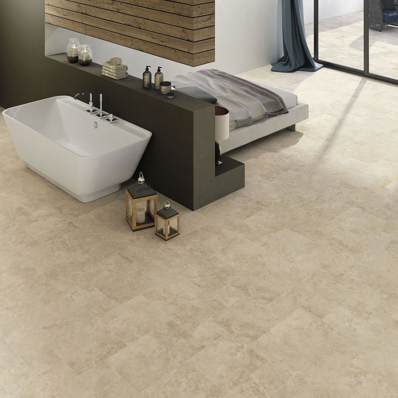 Charme naturel du travertin : un carrelage effet pierre beige nuancé, au rendu chaleureux et élégant, parfait pour les ambiances intérieures.