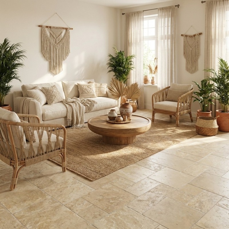 Ce carrelage effet pierre travertin multiformat en ton beige est idéal pour l’intérieur, alliant élégance naturelle et confort raffiné.