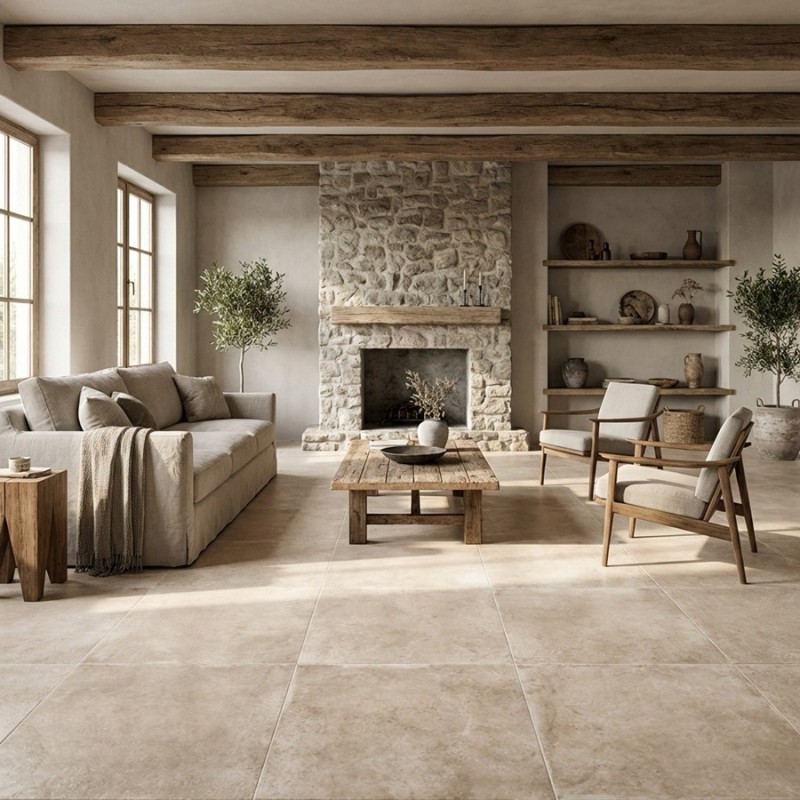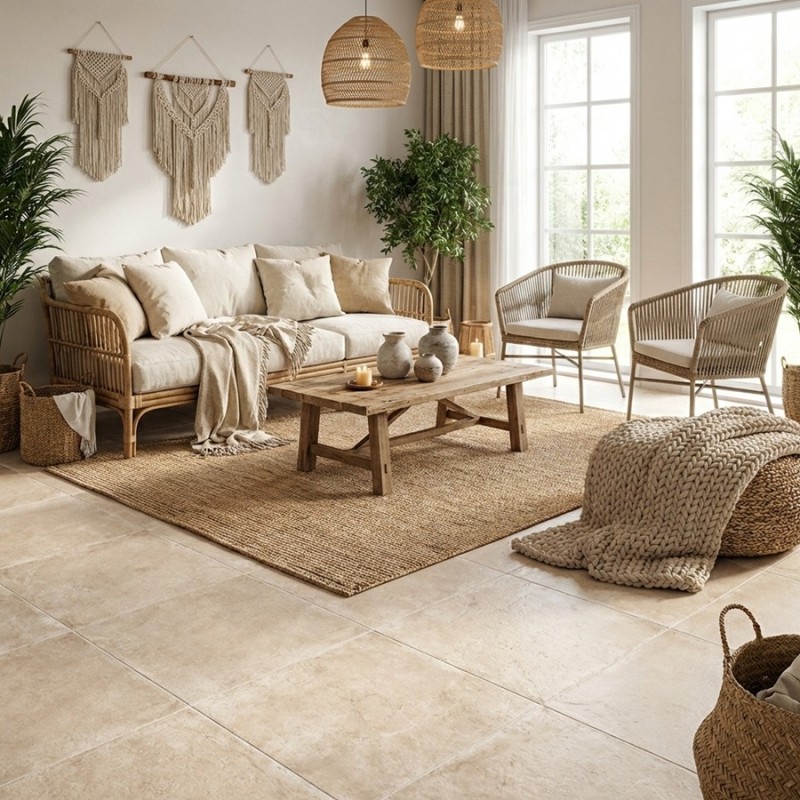 La couleur beige nuancée restitue fidèlement les jeux de tons et les irrégularités du travertin véritable, tout en restant homogène et facile à assortir. Ce revêtement de sol convient parfaitement à une pose intérieure : salon, cuisine, chambre ou salle de bain.