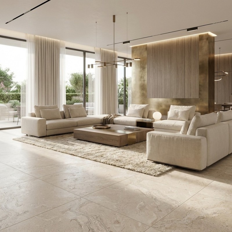 Exemple : dans une pièce à vivre, la pose droite du carrelage travertin beige 60x60 agrandit visuellement le sol et valorise la lumière naturelle.
