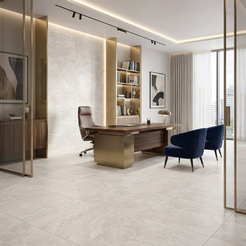 Carrelage effet pierre blanche, lumineux et moderne, idéal pour les pièces intérieures et les terrasses couvertes grâce à sa finition R10 et son format architectural 90×90.