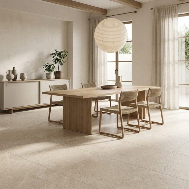 Carrelage grand format effet pierre, au style méditerranéen, idéal pour sublimer les sols et murs intérieurs grâce à son esthétique douce, naturelle et contemporaine.