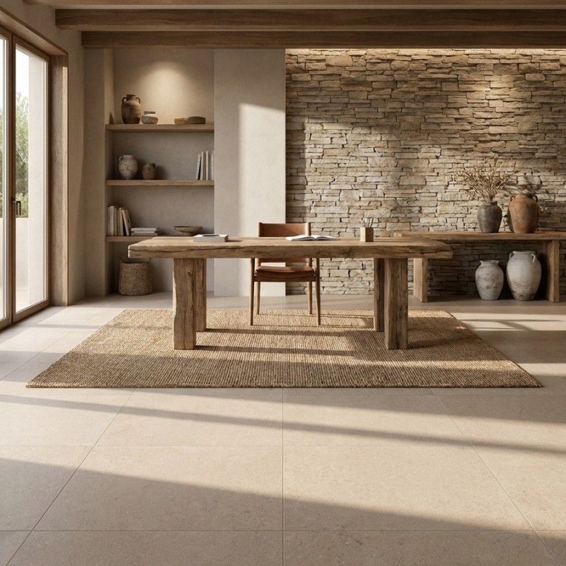 Pour une continuité esthétique entre intérieur et extérieur, ce carrelage effet pierre peut être associé à une version antidérapante de la même gamme pour les terrasses, afin de conserver une parfaite cohérence de style et de surface.