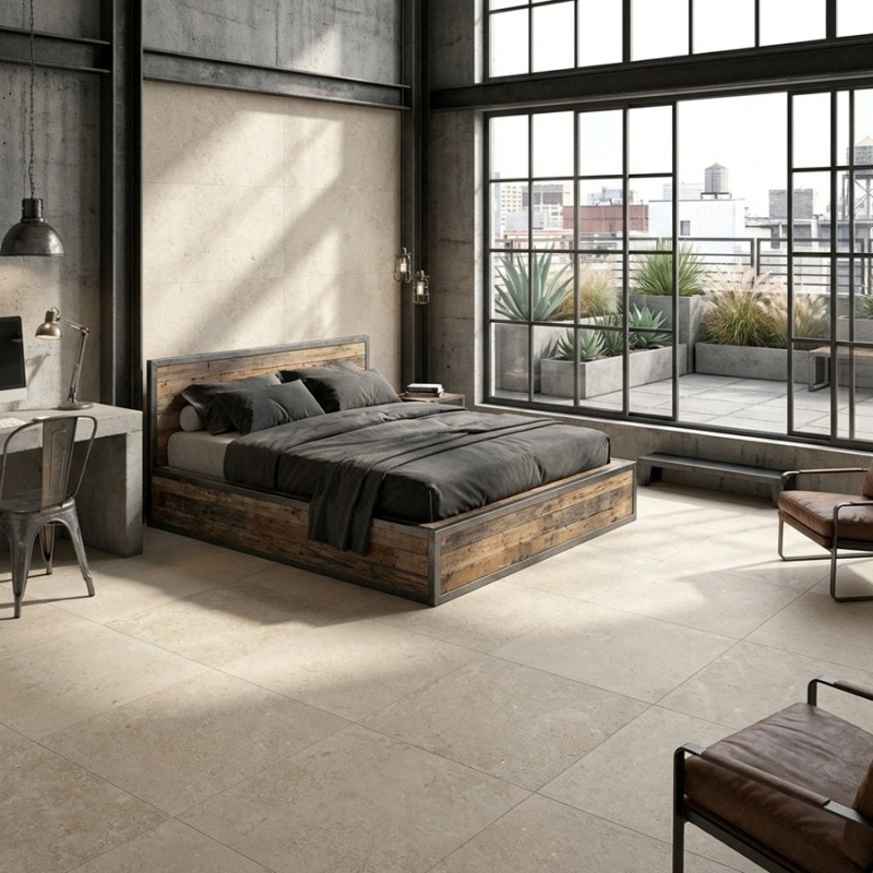 Pour une continuité esthétique entre intérieur et extérieur, ce carrelage effet pierre peut être associé à une version antidérapante de la même gamme pour les terrasses, afin de conserver une parfaite cohérence de style et de surface.