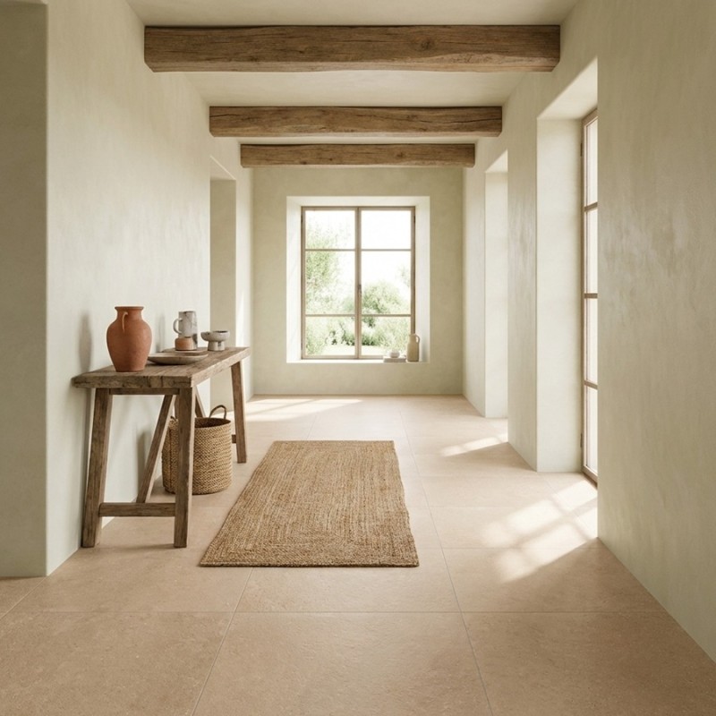 Pour une pose en intérieur, il est recommandé d’utiliser une colle adaptée au grès cérame et de s’assurer que le support soit parfaitement plan. Le choix du joint influence le rendu final : un joint fin, dans une teinte proche du beige, renforcera l’effet pierre et la continuité visuelle du sol.