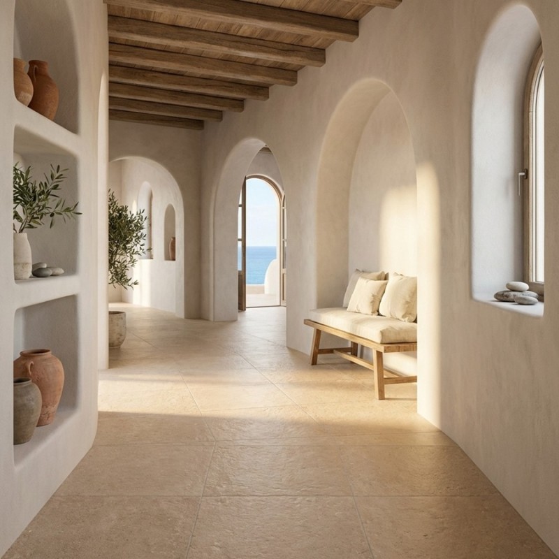 Pour une pose en intérieur, il est recommandé d’utiliser une colle adaptée au grès cérame et de préparer soigneusement le support. Le choix du joint joue un rôle important dans le rendu final : un joint fin, dans une teinte proche du beige, renforcera l’effet pierre et la continuité visuelle du sol.