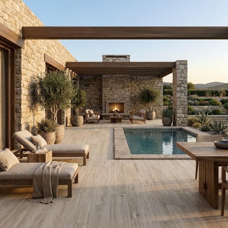 Le carrelage exterieur imitation bois antidérapant Natura Haya se marie parfaitement avec des matériaux naturels comme la pierre, le travertin ou le béton clair. Il s’intègre aussi très bien dans des ambiances bord de mer, nature ou contemporaine, associé à du mobilier en bois clair, en fibres naturelles ou en aluminium.