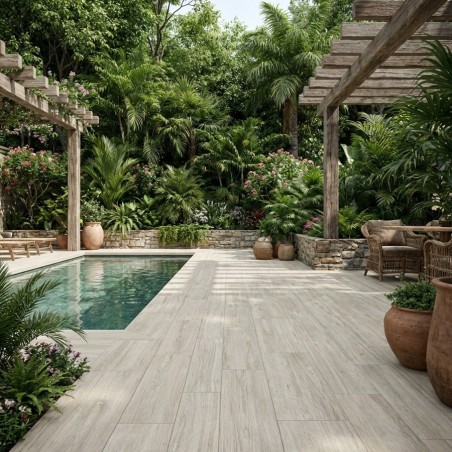 Le carrelage exterieur imitation bois antidérapant Natura Haya séduit par son effet bois naturel aux teintes claires et son format 22,5x90, idéal pour créer une ambiance chaleureuse et authentique en terrasse ou autour d’une piscine. Son aspect bois lumineux apporte une atmosphère conviviale et intemporelle aux espaces extérieurs.