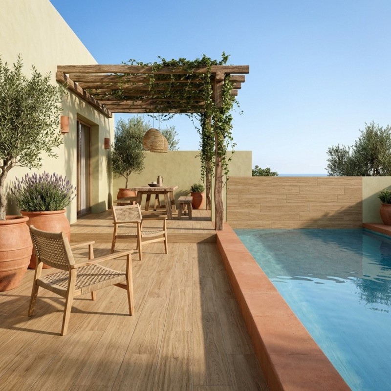 Le carrelage terrasse exterieur imitation bois Natura Roble s’associe parfaitement avec des matériaux naturels comme la pierre, le travertin ou le béton clair pour créer une ambiance chaleureuse et élégante. Il s’intègre aussi très bien dans des extérieurs contemporains, combiné à du mobilier en bois, en aluminium ou en fibres naturelles.