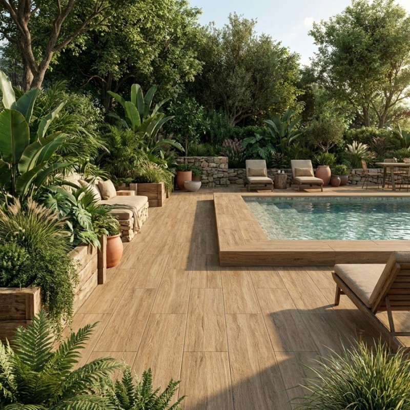 Autour d’une piscine, il crée une atmosphère accueillante et haut de gamme tout en assurant sécurité et durabilité.