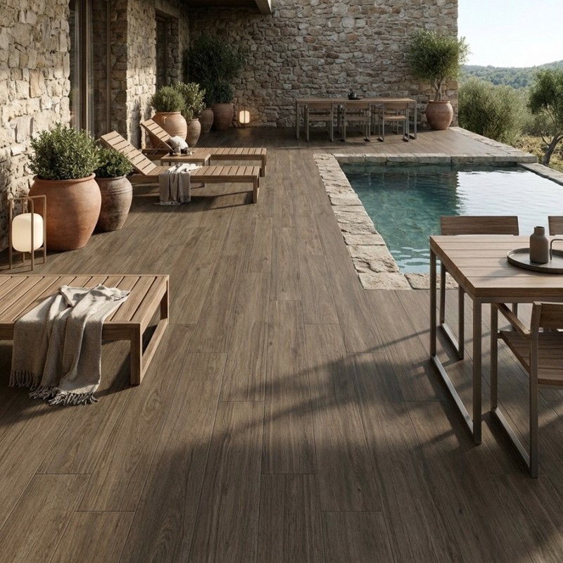 Le carrelage exterieur imitation bois grand format Natura Nogal s’associe parfaitement avec des matériaux clairs comme la pierre naturelle, le béton clair ou des margelles beige afin de créer un contraste élégant. Il s’intègre aussi très bien dans des ambiances contemporaines ou haut de gamme, associé à du mobilier en métal noir, en aluminium ou en bois foncé.