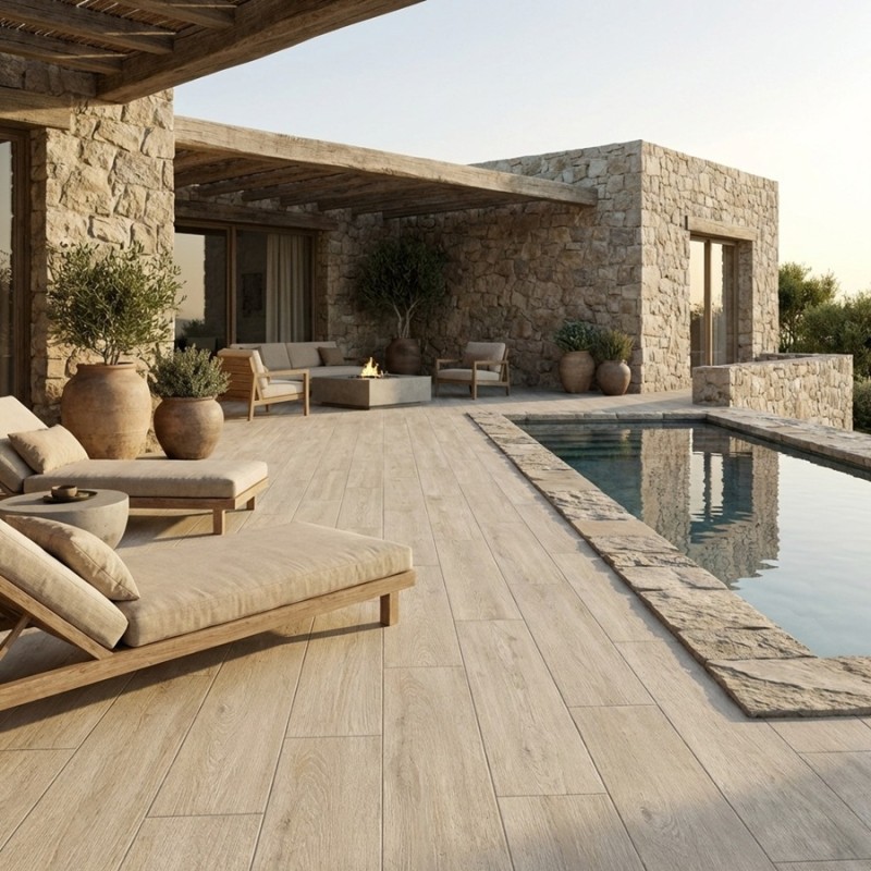 Le carrelage exterieur imitation bois Baku Haya s’intègre facilement dans différents styles d’aménagement. Associé à des matériaux minéraux comme le béton ou la pierre naturelle, il crée un contraste élégant et contemporain. Il fonctionne également très bien avec du mobilier en bois clair, en aluminium ou en fibres tressées pour une ambiance plus naturelle et conviviale.