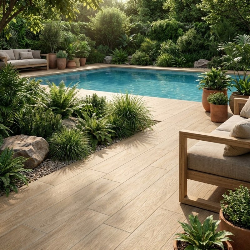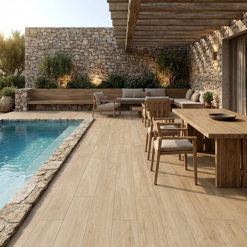Le carrelage imitation bois exterieur piscine Baku Roble se marie parfaitement avec des margelles claires, de la pierre naturelle ou du béton pour créer un contraste élégant autour d’une piscine. Il s’intègre aussi très bien dans des ambiances plus contemporaines, associé à du mobilier en aluminium, en bois foncé ou en fibres naturelles.