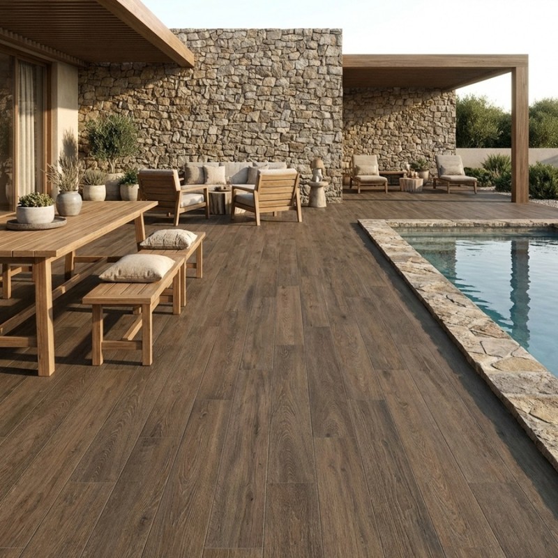 Le carrelage exterieur antiderapant imitation bois Baku Nogal s’associe parfaitement avec des matériaux clairs comme la pierre naturelle, le béton clair ou des margelles beige pour créer un contraste élégant. Il s’intègre également très bien dans des ambiances contemporaines, associé à du mobilier en métal noir, en aluminium ou en bois foncé.