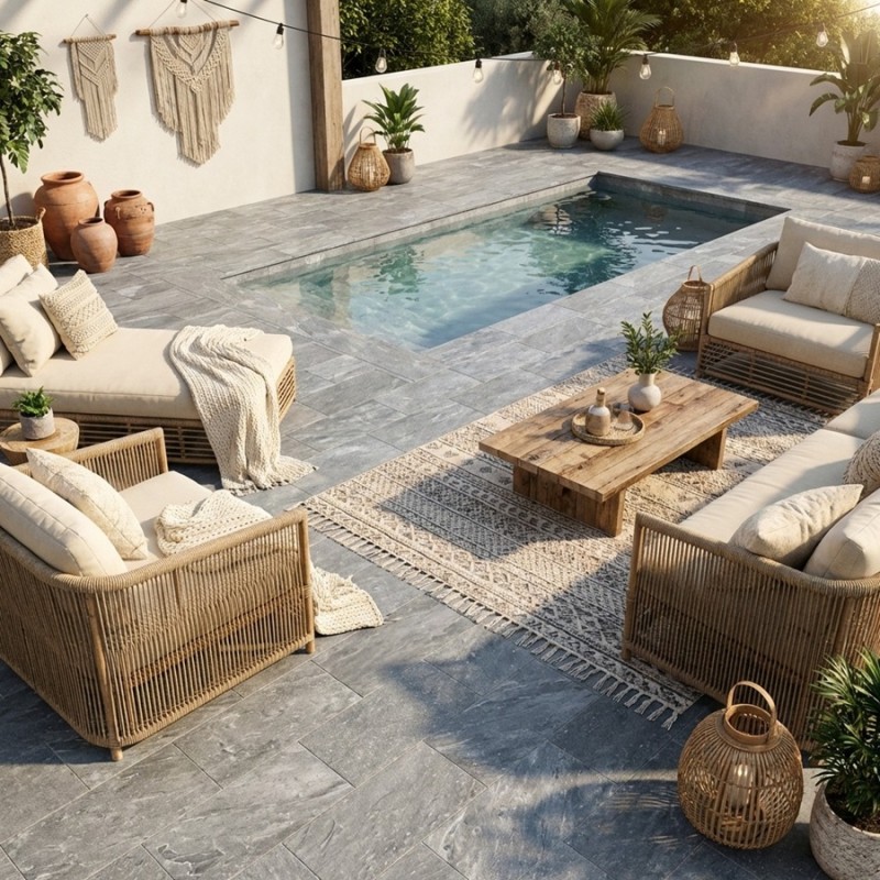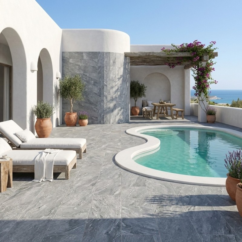 Carrelage BALI ASH R11 antidérapant pour terrasse et plage piscine.