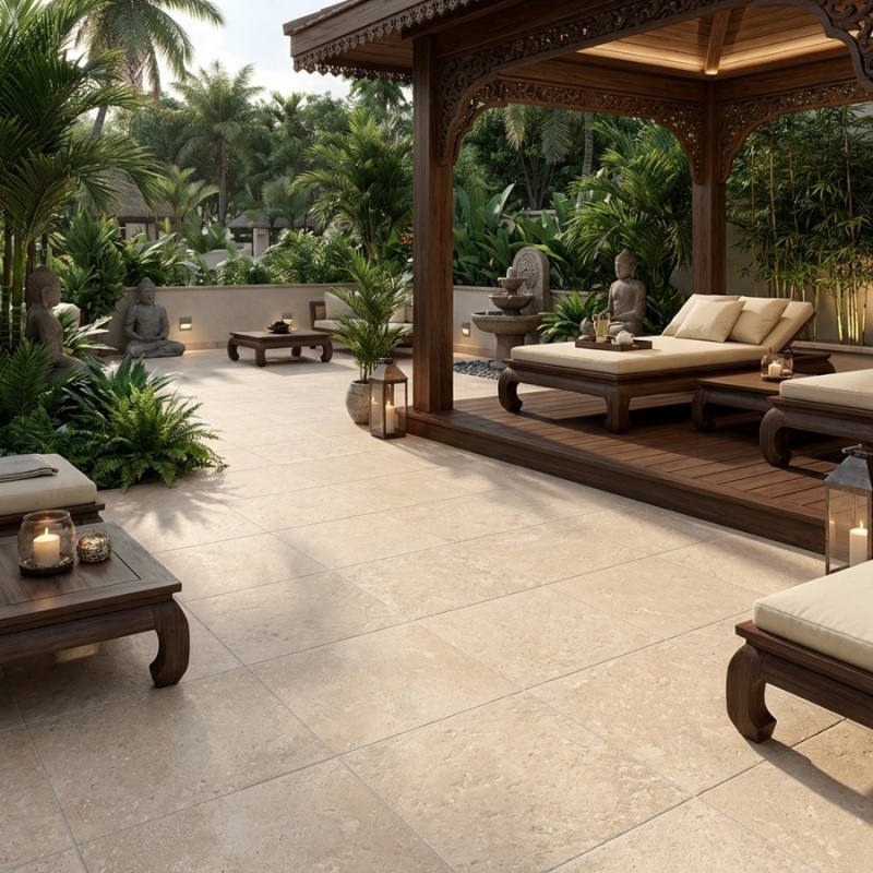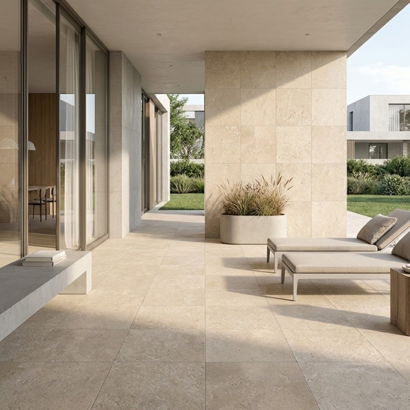 Un carreau effet travertin au format 60x60 cm, antidérapant et élégant, idéal pour les terrasses, balcons ou abords de piscine. Un choix durable et esthétique pour sublimer les extérieurs de la maison.