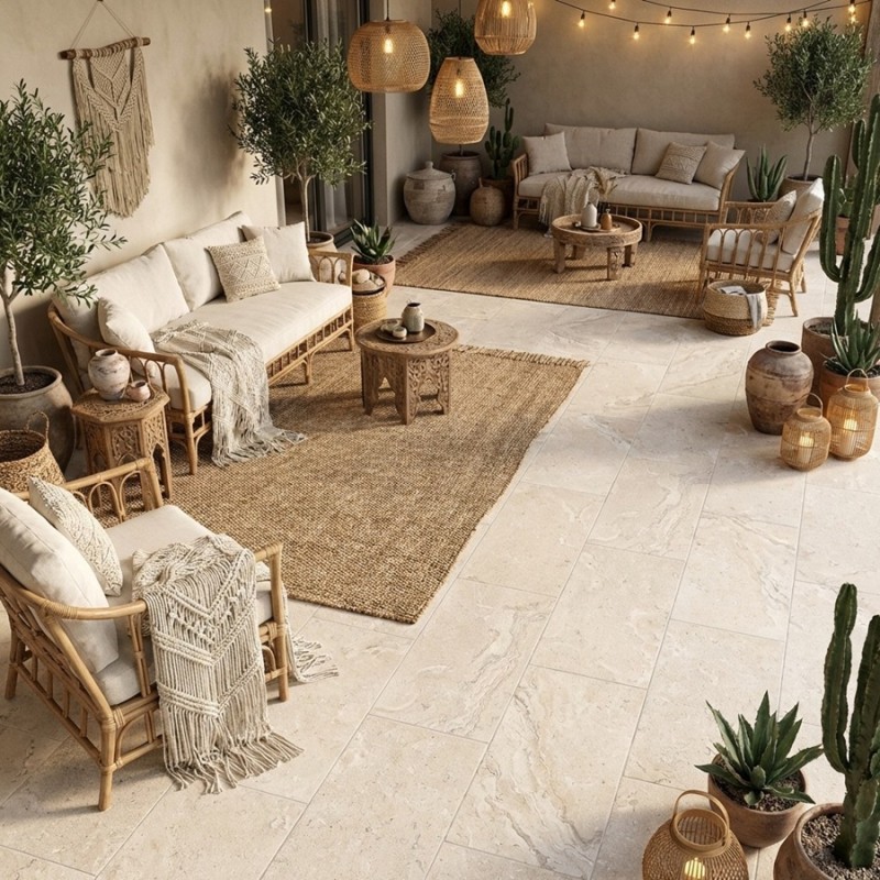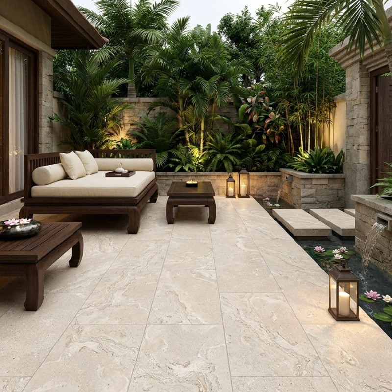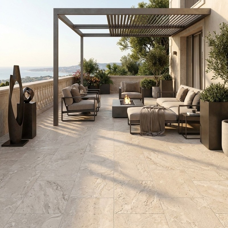 Sa teinte naturelle et sa surface mate adoucissent la lumière, tout en créant un espace accueillant et élégant. Ce carrelage travertin grand format s’adapte aussi bien à un style méditerranéen qu’à une architecture minimaliste moderne.