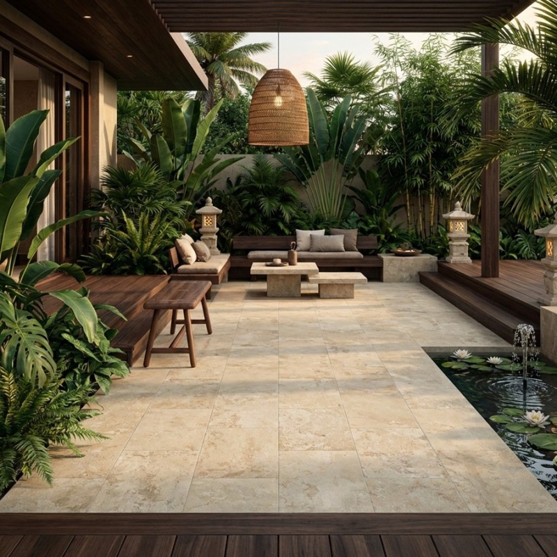 Carrelage effet pierre naturelle au format 60×90, conçu pour les terrasses, balcons et zones humides extérieures grâce à sa finition antidérapante R11 et sa couleur sable chaleureuse.