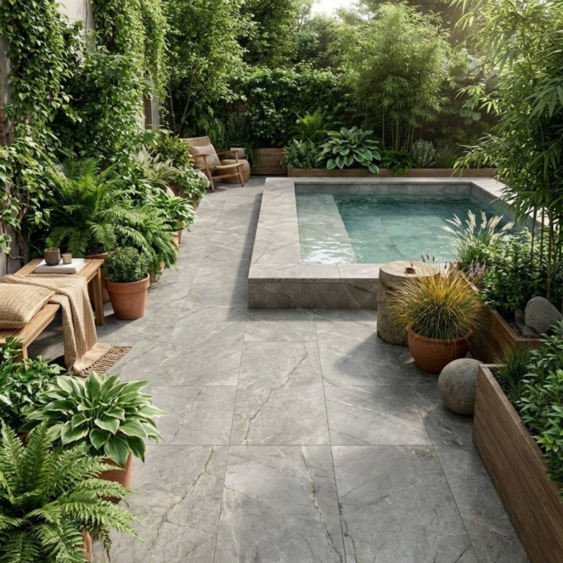 Son format 60×120 rectifié met en valeur la continuité graphique de la pierre, créant des surfaces harmonieuses, hautement architecturales. La finition mate R11, pensée pour l’extérieur, garantit sécurité et confort sur les terrasses, escaliers, coursives ou abords d’habitation, tout en restant parfaitement adaptée aux intérieurs modernes.