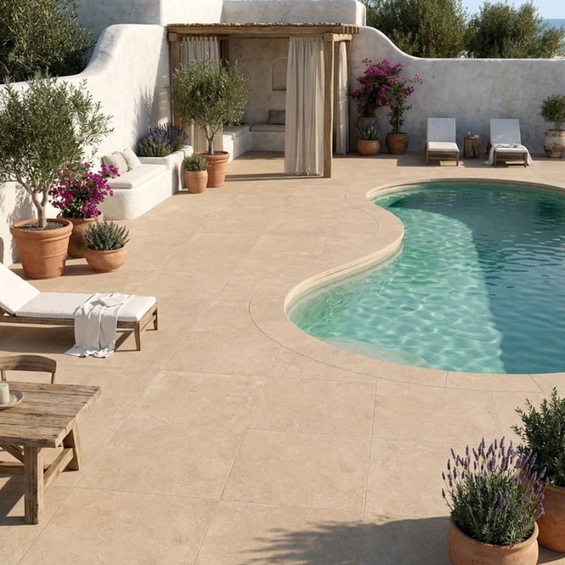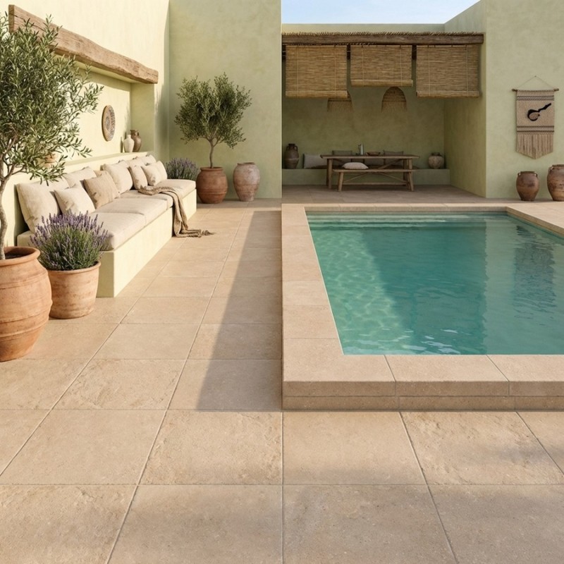 Le carrelage Kyoto Beige 120x120 est idéal pour créer des espaces extérieurs lumineux, contemporains ou d’inspiration architecturale. Associé à du bois clair, du béton ou des matériaux mats, il renforce la sensation d’espace et apporte une élégance naturelle au sol.