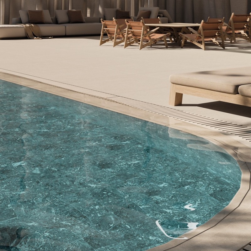 Pour un projet harmonieux entre intérieur et extérieur, ce carrelage extérieur imitation pierre peut être combiné avec une finition plus lisse de la même gamme à l’intérieur, afin de conserver une cohérence de style, de surface et de couleur dans l’ensemble des espaces.