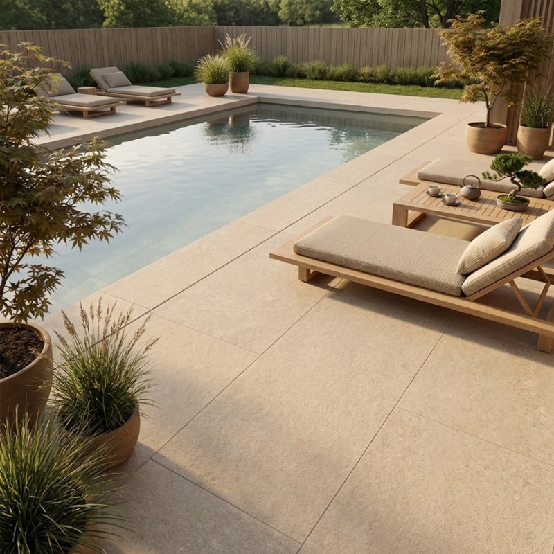 Le carrelage Iwa Bone est idéal pour créer une ambiance naturelle et apaisante. Associé à du bois brut, de la pierre ou des matières minérales, il renforce l’esprit authentique des espaces extérieurs.