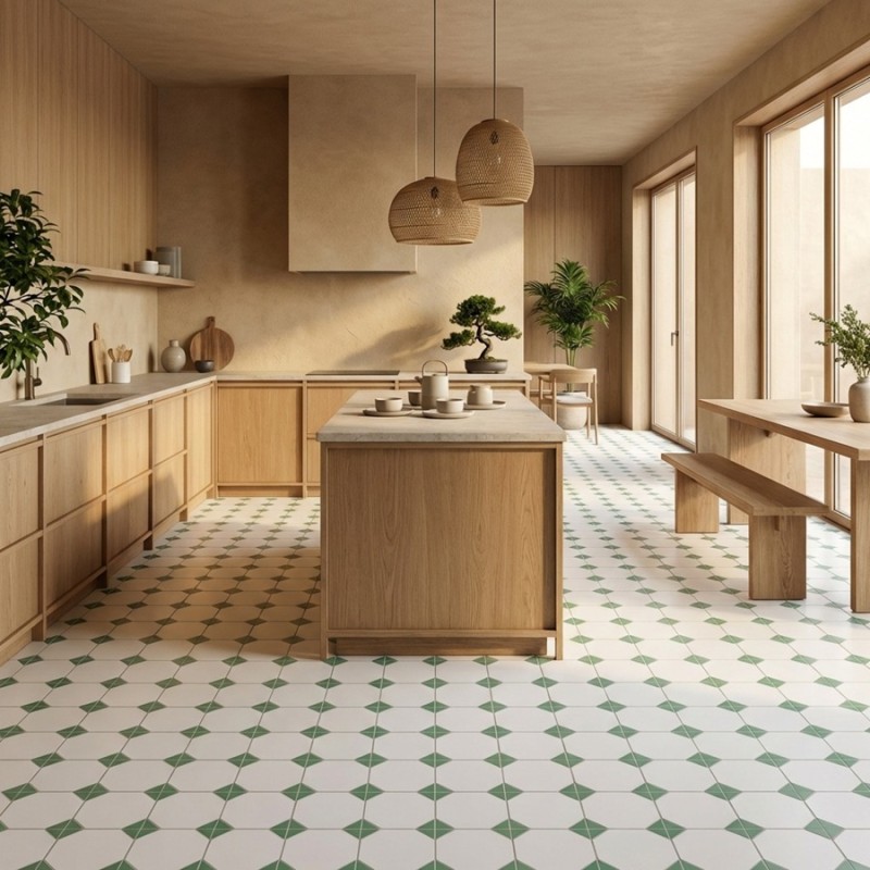 Ce modèle recrée une composition cabochon sans multiplier les pièces : le carreau 33x33 intègre un cabochon central uni (couleur verte pleine, sans motif) et des angles raccords. À la pose, les quarts d’angle se complètent d’un carreau à l’autre, assurant une continuité nette du dessin et un vrai rendu octogonal.