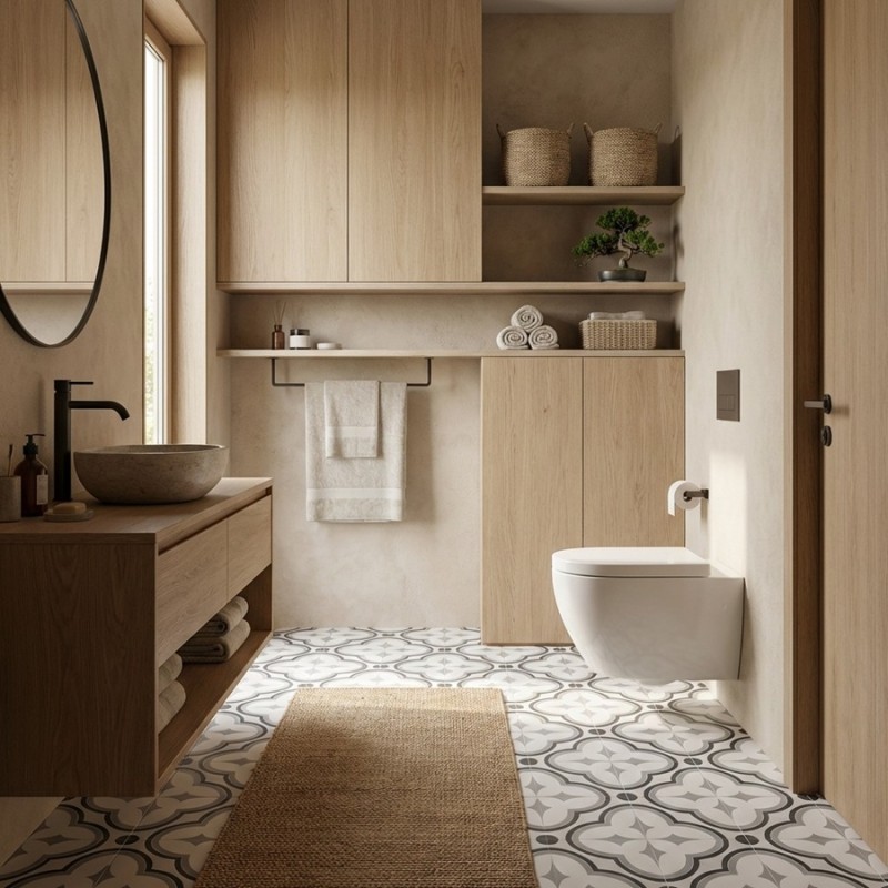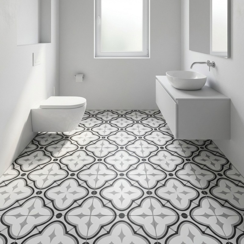 Le carrelage Frame Tie 15x15 cm propose un design graphique contemporain inspiré des carreaux de ciment traditionnels. Son motif noir et gris forme un décor abstrait à l’effet visuel fort, tout en gardant une palette douce et facile à intégrer. Avec son fond blanc vieilli, il structure l’espace tout en ajoutant une touche vintage. Idéal en sol ou crédence.
