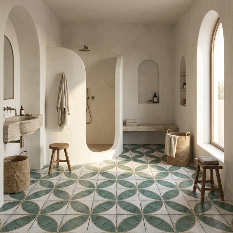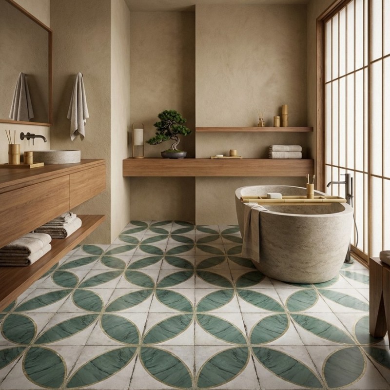Inspiré des revêtements anciens, le carrelage Renaissance Mandorla 20x20 cm met en valeur un motif de mandorle vert marbre aux reflets subtils, encadré d’un trait doré. Son fond blanc patiné imite l’usure naturelle du ciment, renforçant son authenticité. Utilisé seul ou dans une composition Renaissance complète, il signe un décor graphique au style noble et intemporel.