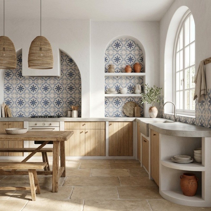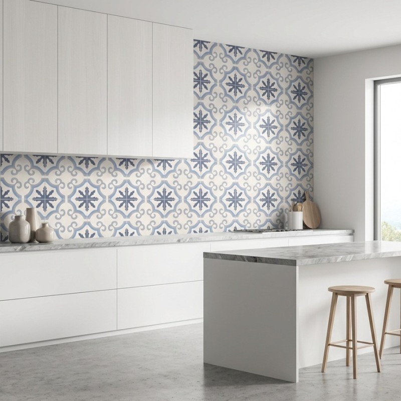 Le carrelage Galdana 45x45 est un carreau imitation ciment au style graphique assumé. Son motif se compose de formes géométriques dynamiques dans un bleu intense, plus profond et contrasté que les modèles plus doux comme Palamos ou Javea. Ce dessin vif et rythmé rappelle les décors des maisons méditerranéennes et crée une véritable signature visuelle dans la pièce.