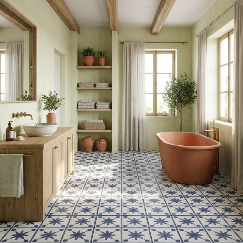 Son format carré 45x45 assure une pose simple et régulière, tout en mettant parfaitement en valeur le motif étoilé. Le Denia s’adapte au sol comme au mur, permettant de créer des zones décoratives fortes : frises murales, crédences, encadrements ou sol graphique.