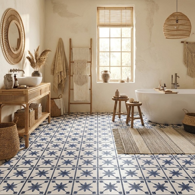 Le carrelage Denia 45x45 est un carreau imitation ciment dont le motif étoilé bleu foncé crée une forte identité visuelle. Contrairement aux motifs ondulés (Gandia) ou floraux (Javea), le Denia mise sur une géométrie nette et symétrique, parfaite pour structurer un sol, un mur ou un espace décoratif. Cette esthétique a le charme des intérieurs anciens, revisité dans une version plus moderne grâce à la sobriété du bleu et du gris clair.