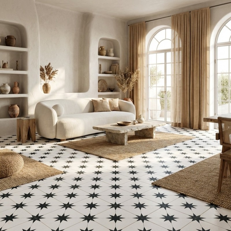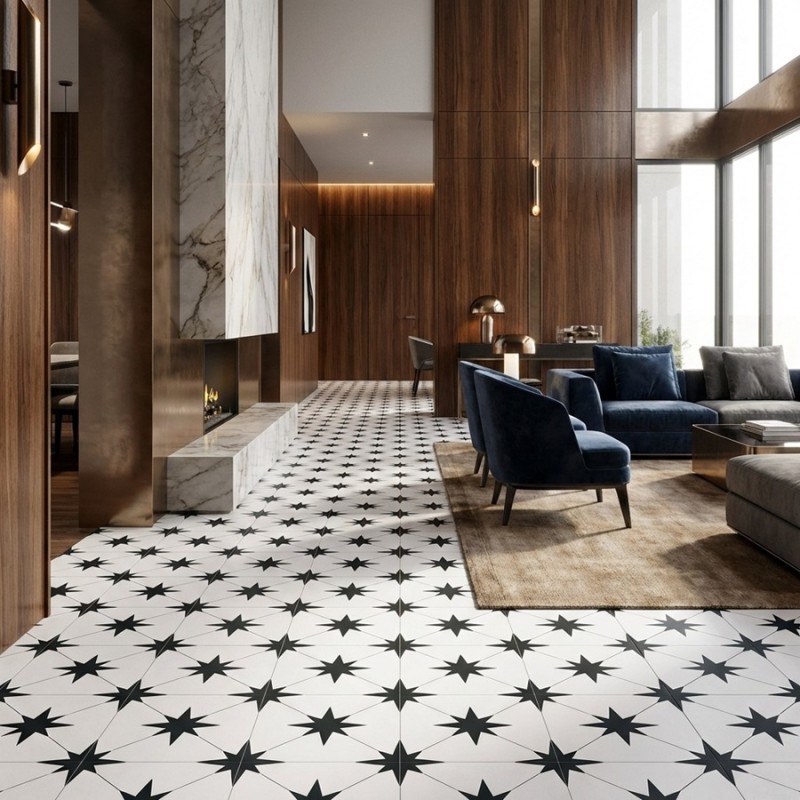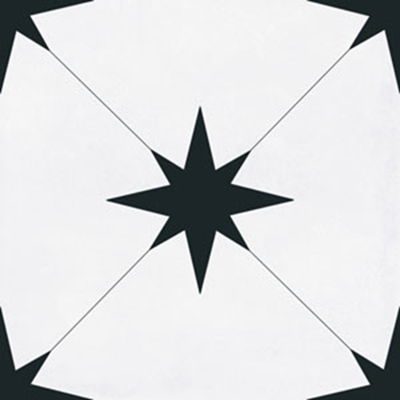 Ce carrelage décoratif joue sur le contraste Noir & Blanc avec un dessin central type Cabochon qui rappelle les compositions traditionnelles mêlant Octogone et cabochon. Même si le carreau est carré, l’œil retrouve une lecture octogonale grâce au décor : un effet Octogonal très recherché dans les entrées et les pièces de passage.