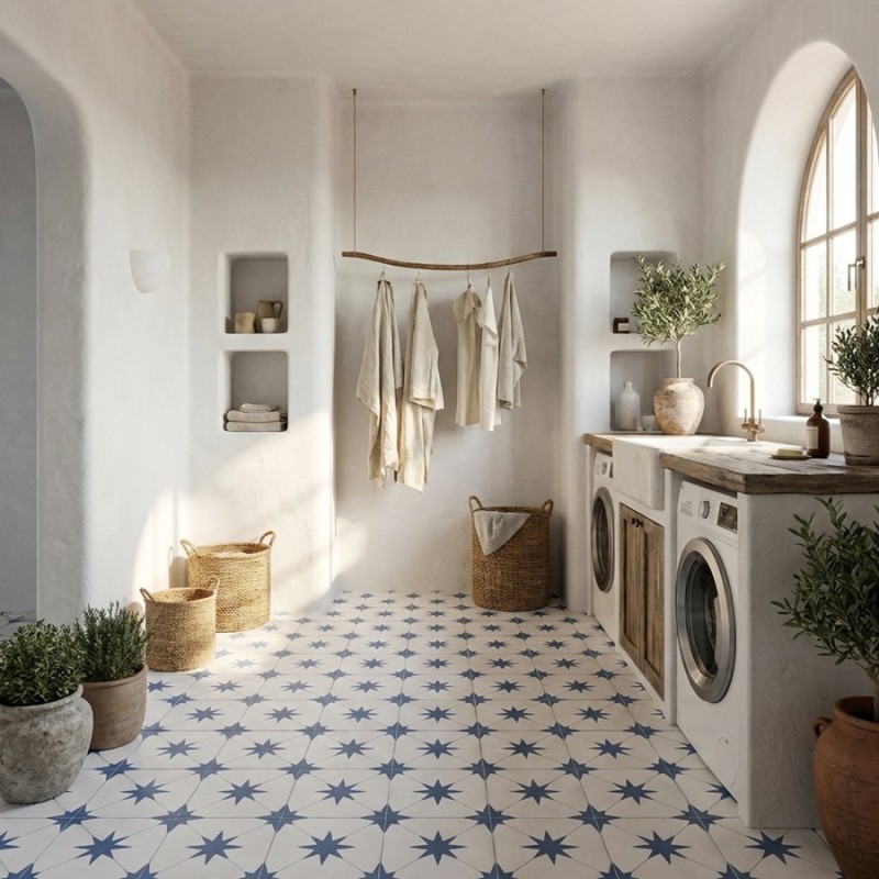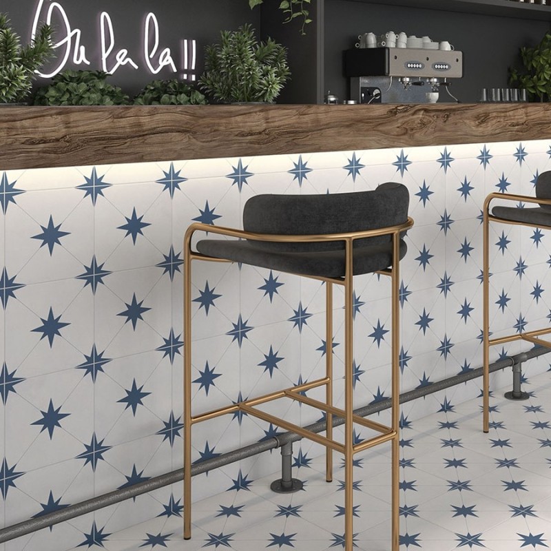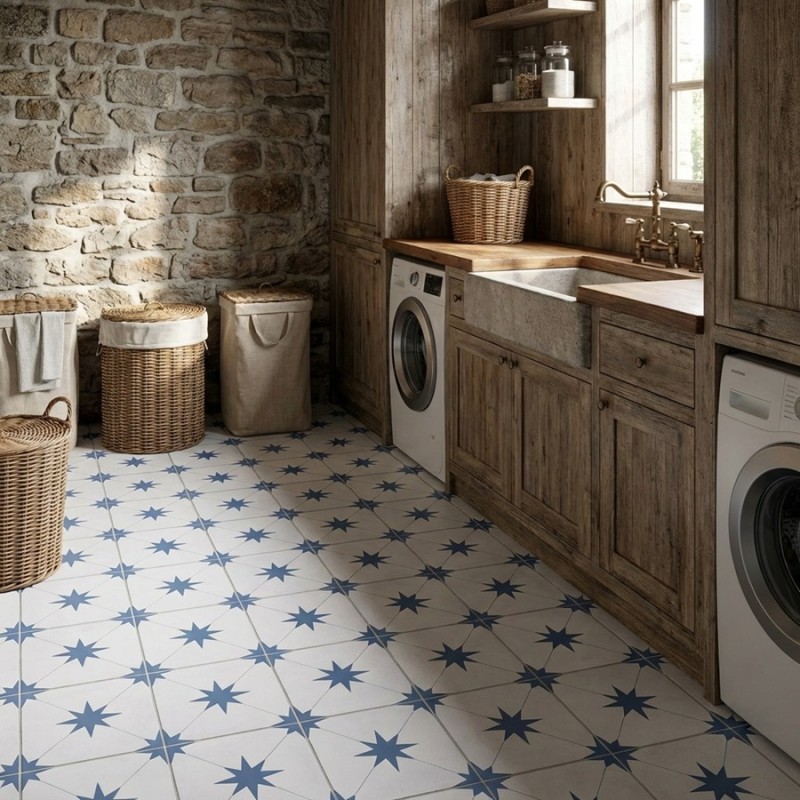 Le carrelage Levant Bleu apporte une touche déco plus affirmée, tout en conservant l’élégance d’un motif type cabochon (effet étoile dans les angles). Son look s’inscrit aussi dans l’univers des carreaux de ciment, idéal pour personnaliser une pièce.