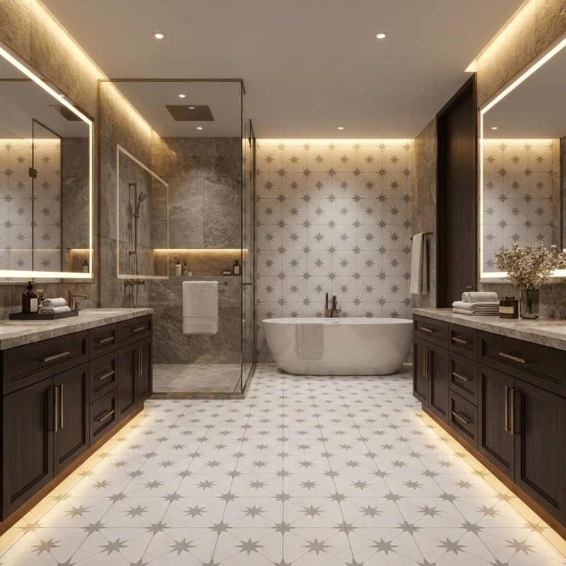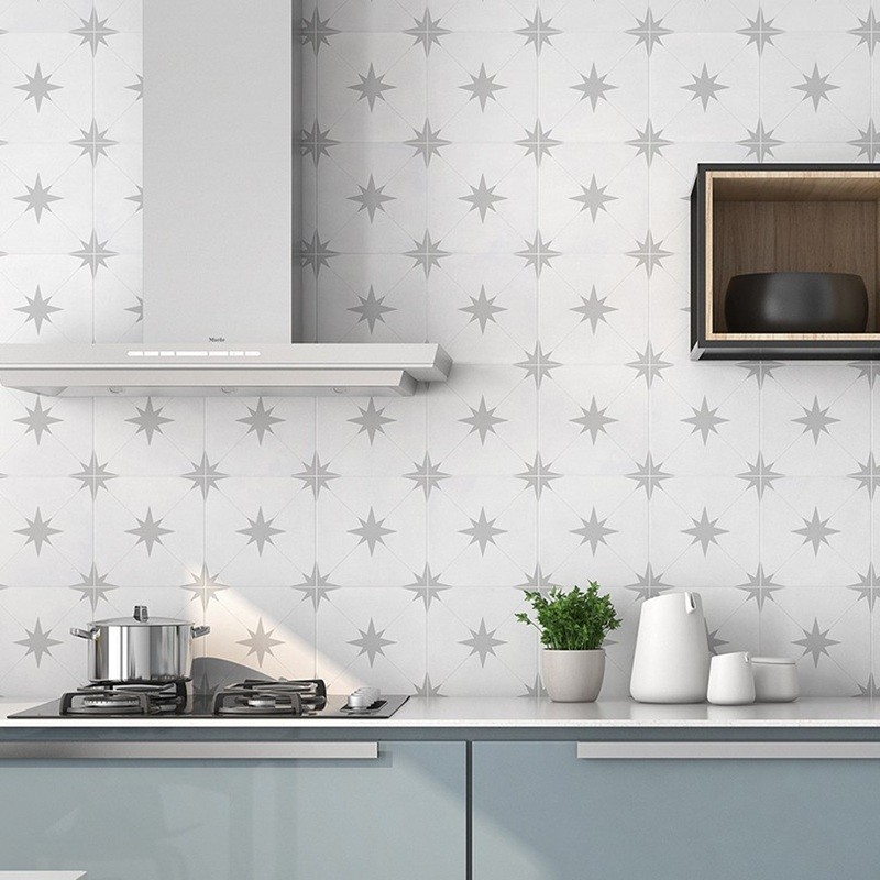 Avec sa teinte sobre, le carrelage Levant Gris offre un décor raffiné inspiré du style cabochon, grâce aux motifs en étoile aux angles. Il reprend également les codes des carreaux de ciment, parfait pour une ambiance classique ou contemporaine.