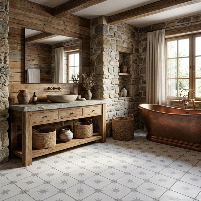 Pour le sol, un joint fin dans une teinte gris clair ou pierre permettra de préserver l’harmonie du dessin. Au mur, ce carrelage peut être posé en total look ou en panneau décoratif, selon la pièce. Dans une cuisine, il est particulièrement apprécié en crédence ou pour délimiter un espace repas.