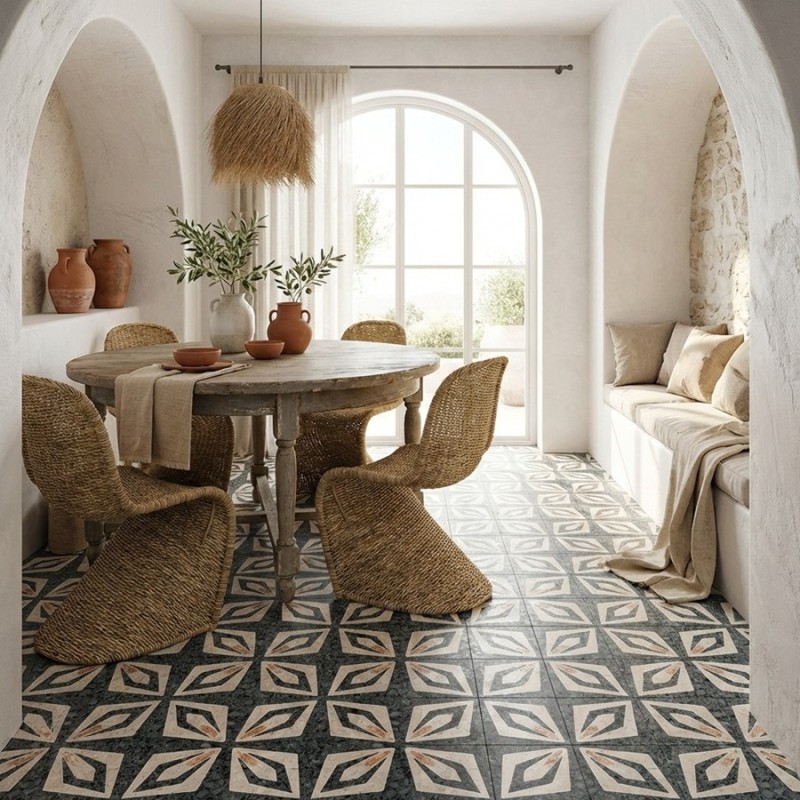 Le carrelage VIETRI NEGRO 20x20 est un carrelage effet terrazzo résolument différent des autres collections. Là où le terrazzo classique joue sur un motif aléatoire, VIETRI adopte une composition géométrique structurée, directement inspirée de l’univers du carreau de ciment, tout en conservant une texture et une finition terrazzo.
